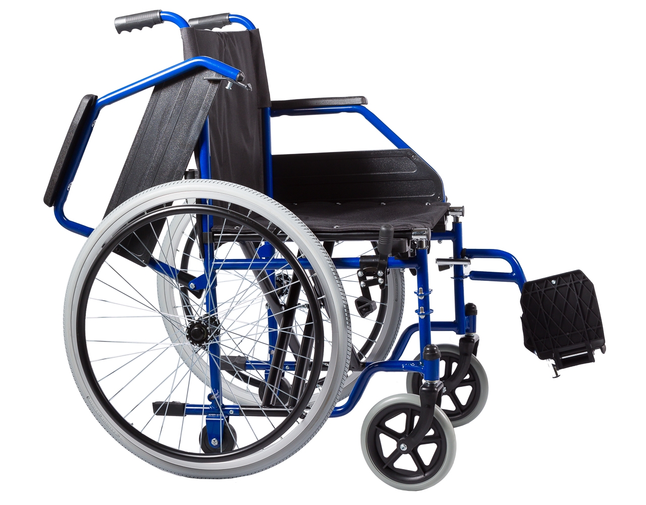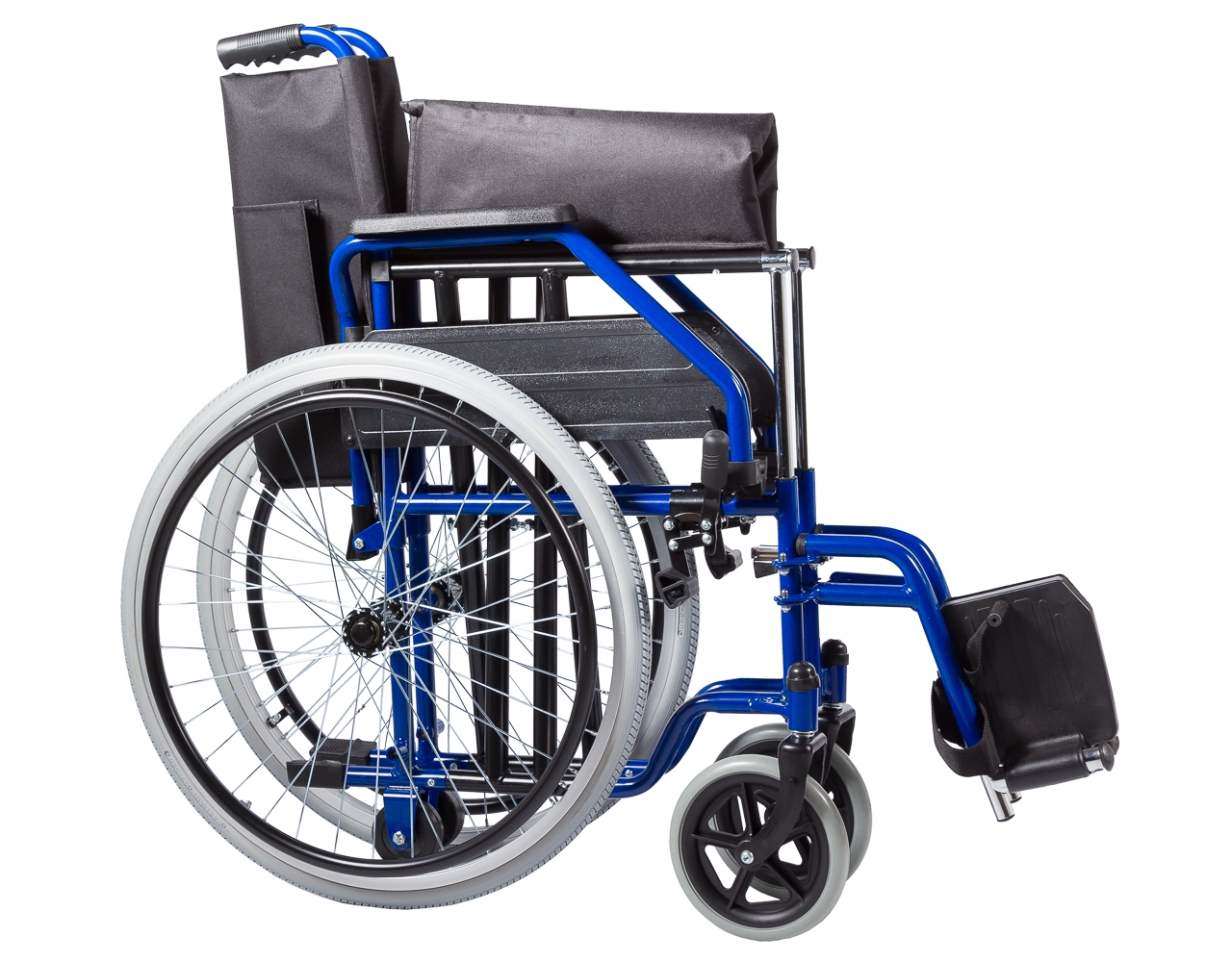Opvouwbare rolstoel met een blauw stalen frame en zwarte nylon bekleding. Voorzien van grote achterwielen met hoepel zodat de gebruiker zelf de rolstoel in beweging kan brengen.
