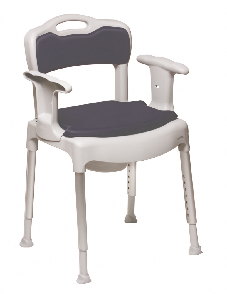 De Swift Commode is eenvoudig in hoogte instelbaar. De Swift Commode is zeer comfortabel en kan licht voorover gekanteld ingesteld worden om het opstaan te vergemakkelijken. De toiletemmer heeft een goed afsluitende deksel welke automatisch sluit wanneer de toiletemmer wordt uitgenomen ( kan via de bovenkant verwijderd worden). De Swift Commode wordt standaard met comfortabele zit- en rugbekleding en toiletemmer geleverd.
