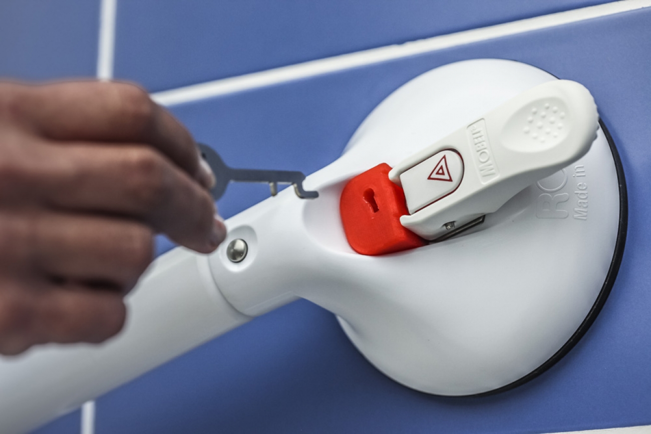 De Mobeli KiephendelStop waarmee de beugel zogezegd op slot gezet kan worden, is geschikt voor personen die niet zelfstandig met de mobiele wandbeugel om kunnen gaan (bijvoorbeeld demente personen en kinderen). Met de KiephendelStop zijn de Mobeli wandbeugelsystemen beveiligd tegen diefstal in openbare ruimtes, zoals hotels, ziekenhuizen en verzorgingstehuizen.