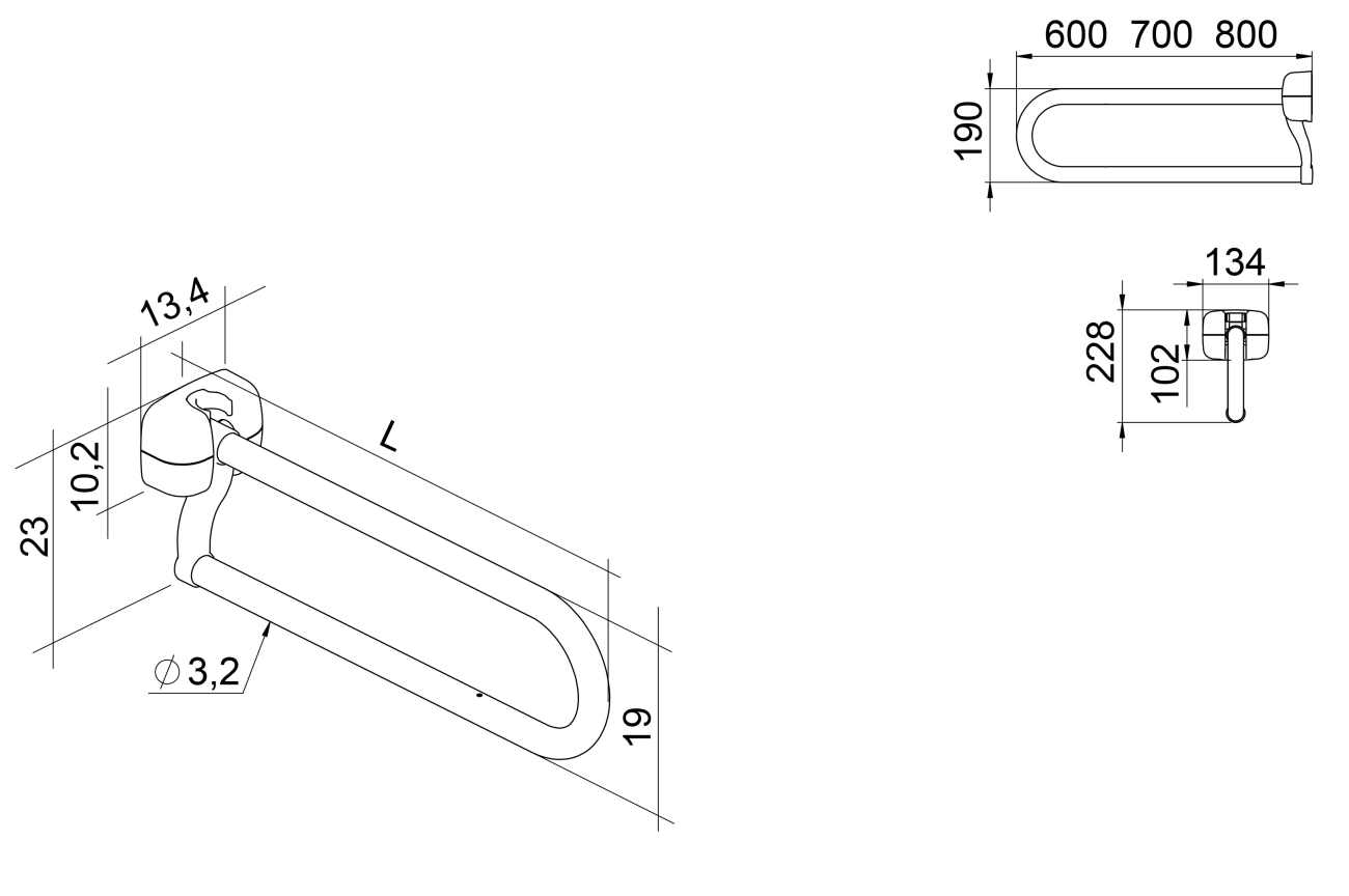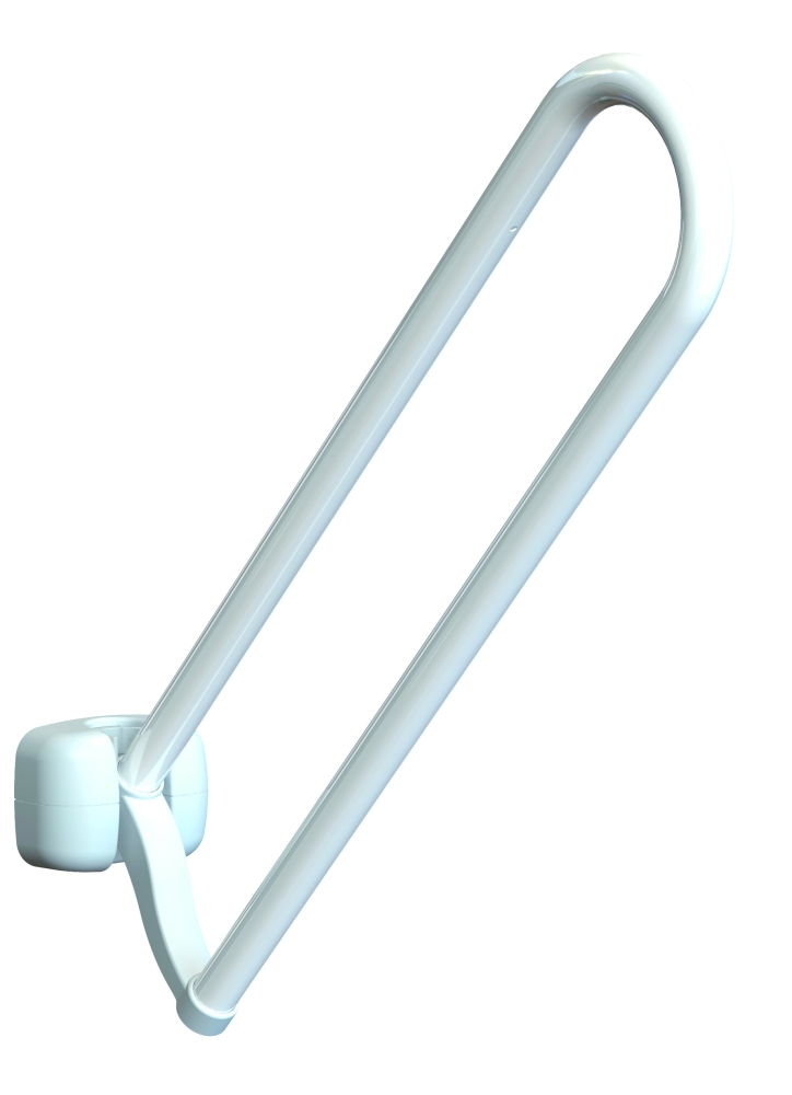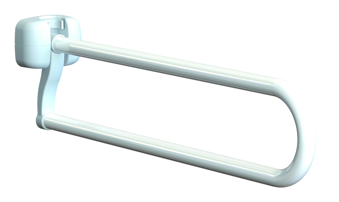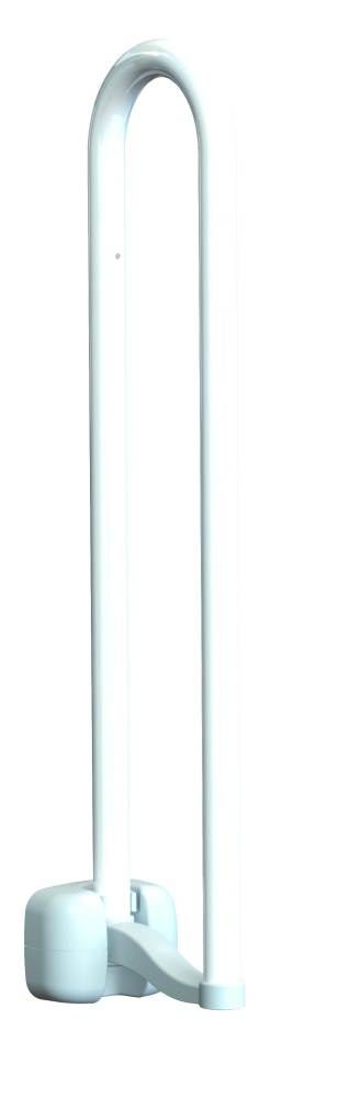 Opklapbare toiletbeugel voor extra ondersteuning rondom het toilet. Gemaakt van gecoat staal. In opgeklapte verticale stand vergrendelt de beugel. Wordt op vier punten aan de muur bevestigd. Voorzien van kunststof cover voor een verborgen bevestiging. Diameter buis 3,2 cm.  Montagemateriaal niet inbegrepen.