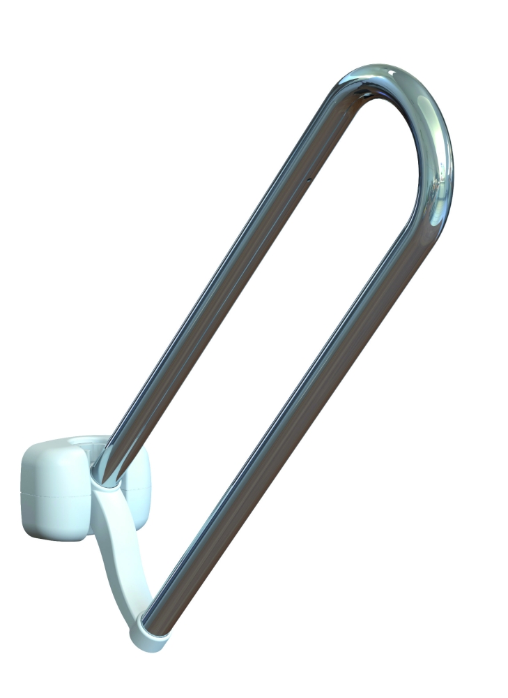 Opklapbare toiletbeugel voor extra ondersteuning rondom het toilet. Gemaakt van roestvrij staal. In opgeklapte verticale stand vergrendelt de beugel. Wordt op vier punten aan de muur bevestigd. Voorzien van kunststof cover voor een verborgen bevestiging. Diameter buis 3,2 cm.  Montagemateriaal niet inbegrepen.