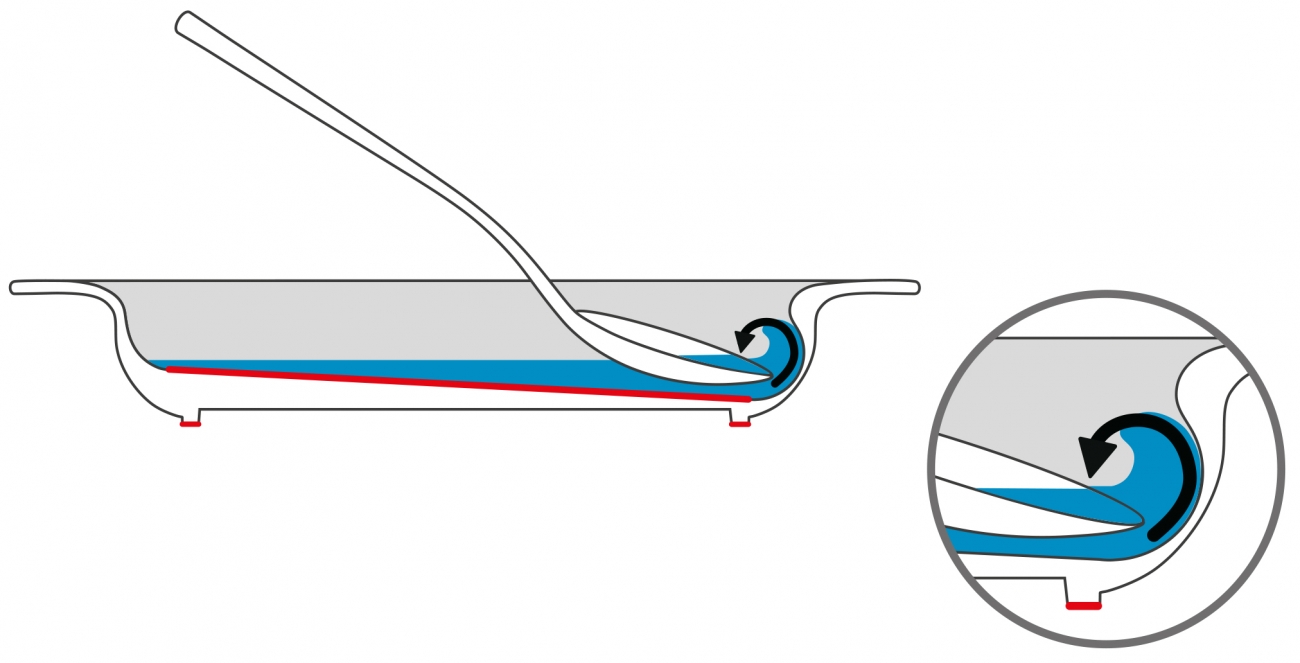 – Een onopvallende naar binnenvallende rand waardoor het voedsel door de rand terug valt op de lepel.