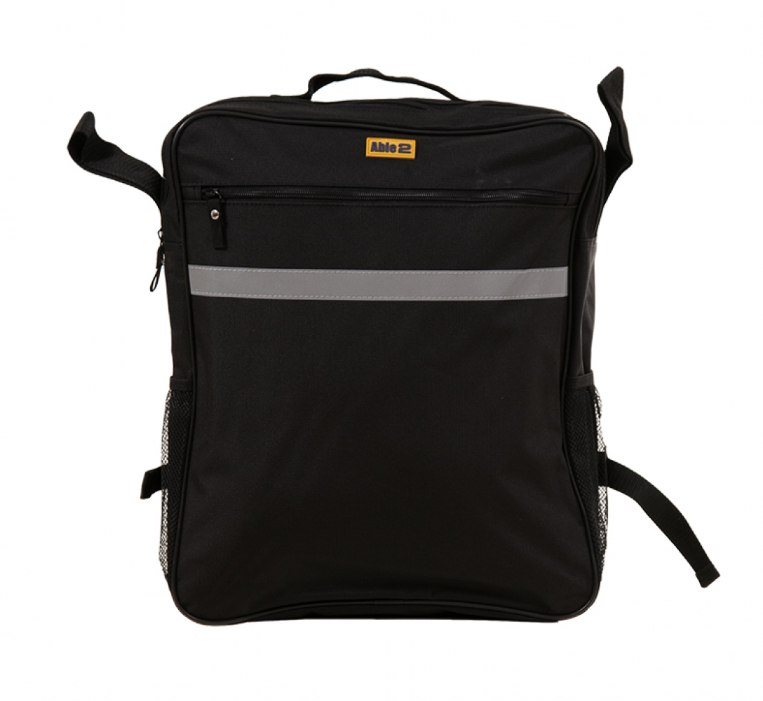Stevige en duurzame tas voor rolstoel of scootmobiel met of zonder hoofdsteun. Één groot opbergvak, een klein voorvakje met rits en twee zijnetjes. De twee zijnetjes zijn ideaal voor het opbergen van een flesje drinken. Reflecterende veiligheidsstrip.